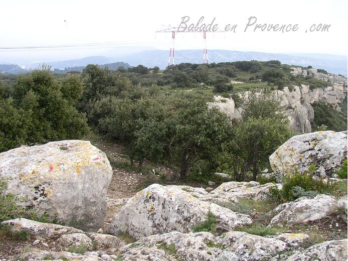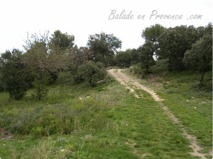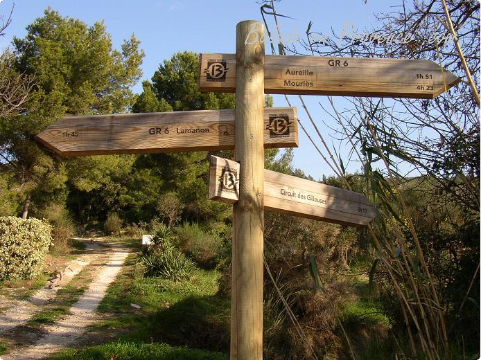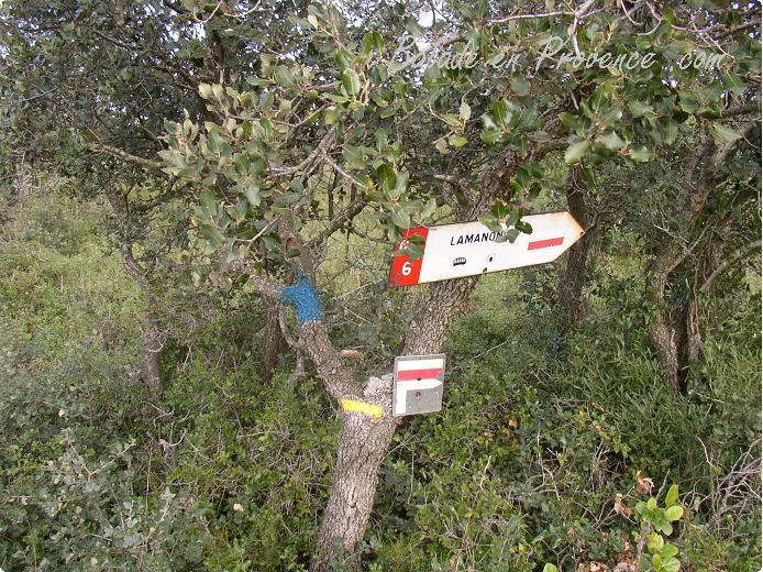 Continuer la route sur 250 mètres, puis prendre la première route à gauche. La suivre sur 500 mètres, et prendre le chemin à droite, GR 6 (tracé rouge/blanc) vers 'Lamanon' 2 .