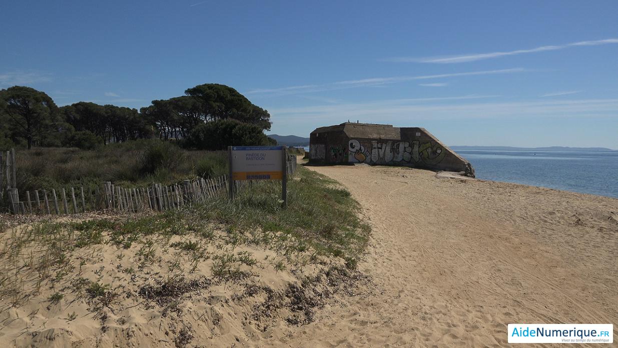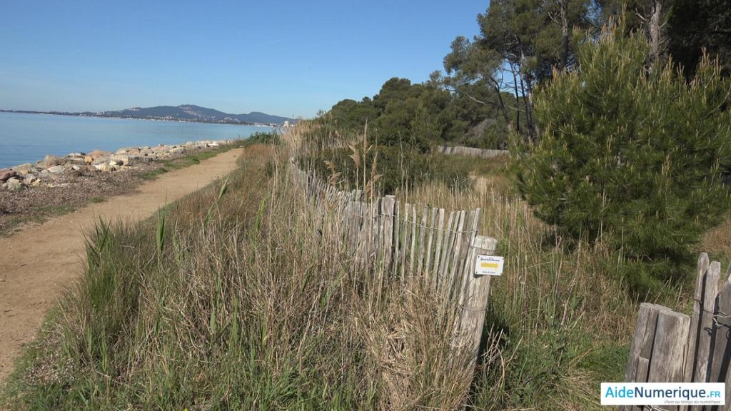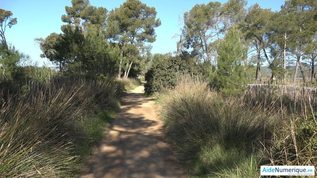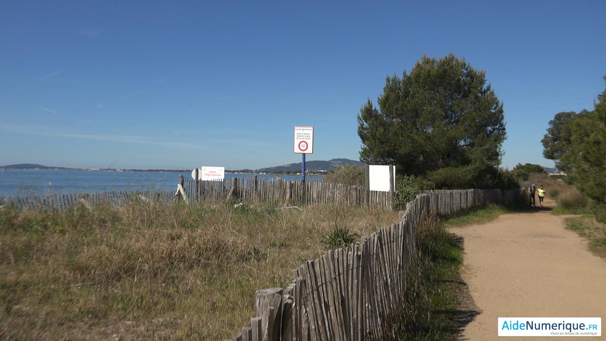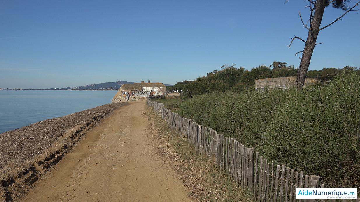 Continuer sur l’avenue jusqu’à la barrière. Passer la barrière, entrée sur la pinède du Bastidon . Prendre à gauche puis continuer sur ce large chemin en direction de la mer. Passage devant un blockhaus. Arrivée près de la mer et de la plage Miramar, le chemin tourne à droite. Passage sur une large bande de sable en direction d’un nouveau blockhaus. En face de nous, l’île de Porquerolles. Passage sur un petit pont. Quittez le sentier près de la mer. Sur la droite, début des vieux salins d’Hyères. Prendre à droite, sentier balisé tracé jaune. Un large chemin pour balader. Vue sur l’île de Porquerolles. Toujours un large chemin ombragé. Sur la droite, les vieux salins. Par moment, le chemin se rapproche de la mer. Les vieux salins. Panneau d’information sur le trait de côte. Le large chemin se transforme en sentier. Panneau d’information sur les vieux salins d’hyères. Nous suivons le balisage tracé jaune. le sentier devient un petit sentier. Toujours la mer accessible sur notre gauche. Retour sur le petit sentier des salins. Une plage naturisme pour les amateurs. Vue sur le parking de la plage des salins à Hyères. Arrivée à une barrière, la franchir puis prendre à gauche. Direction la mer. Retour à la plage Miramar en longeant la mer. Un chemin facile à suivre. De beaux endroits pour la saison estivale. Retour au petit pont, le franchir. Continuer toujours tout droit en direction de la page Miramar.