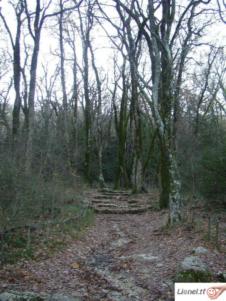 - Monter le chemin, entrecoupé de nombreux escaliers de pierre en direction de la grotte (panneaux, tracé GR).