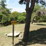 Panneau indicateur. On descend à l’arrière du moulin puis prendre la vielle route sur la droite..