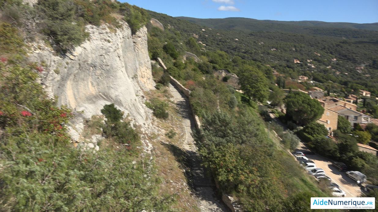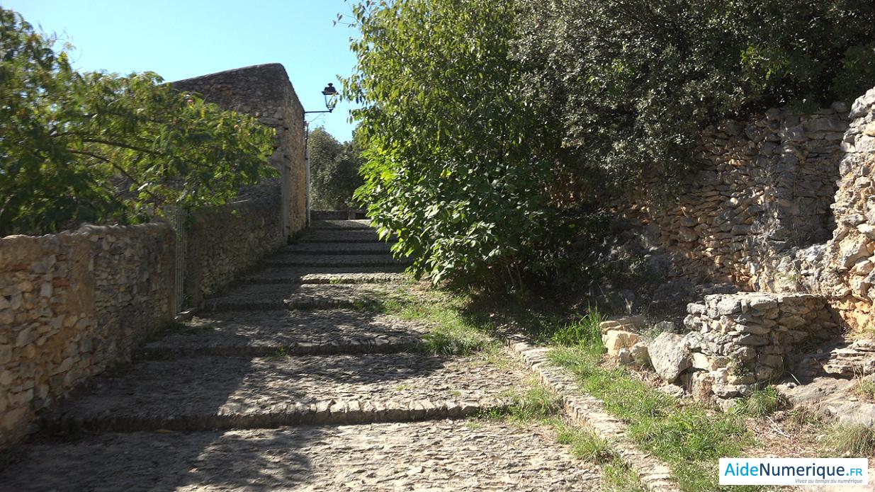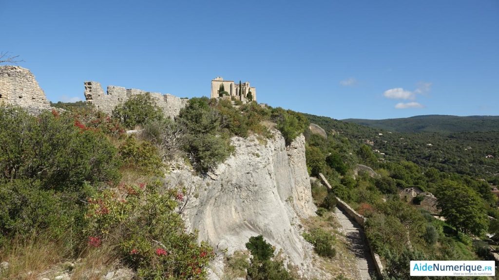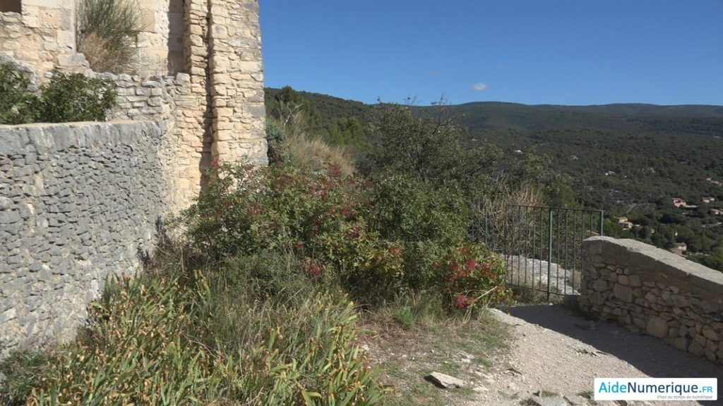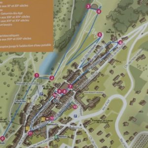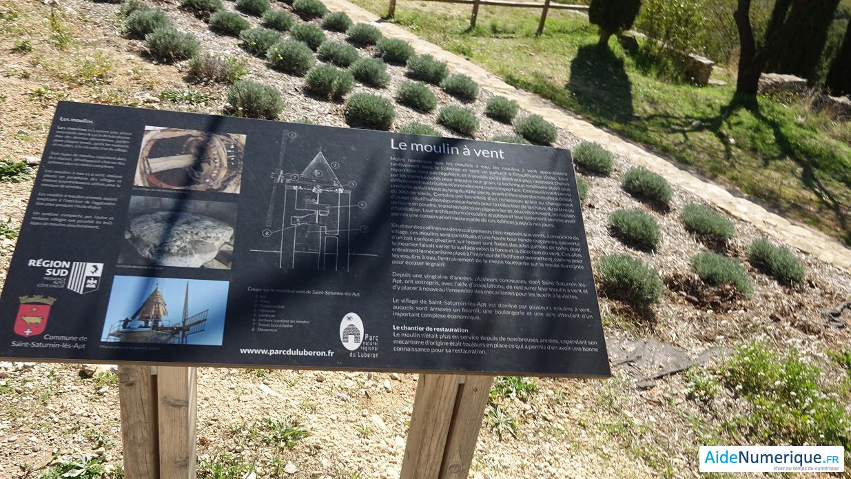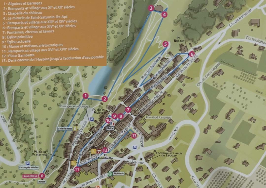 Le village de Saint-Saturnin lès-Apt est perché sur un éperon rocheux, ce qui offre des vues superbes sur le Luberon, les Alpilles … Le village trouve ses origines au Xe siècle et fut sous la seigneurie des Agoult vers 1190, puis d’autres seigneurs, etc. Il a évolué au fil des siècles avec des constructions médiévales, des remparts, des agrandissements aux XIIᵉ, XVe, etc. La balade part du moulin à vent, passe à côté du barrage puis longe les anciens remparts et villages pour arriver à la chapelle castrale puis redescend dans le village pour passer le portail Ayguier et finir par arriver devant l’église Saint-Etienne (*1).
